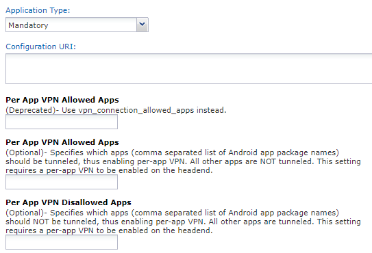 We have configure an App Catalog rule in order to deploy the app via a Managed Play Store and we have set the Application Type to "Mandatory". The App Configuration let us specify which apps have to be tunneled.