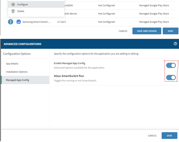 I read on the forum that we might need to install Samsung Knox Service Plug-In app first and enable the "Allow Smart Switch" option. See the solution on this topic: https://discussions.soti.net/thread/allow-smart-switch-on-samsung-android-enterprise-devices/?quote=c021520b-a1c8-4408-ba0e-1b06063b5c51#createpost