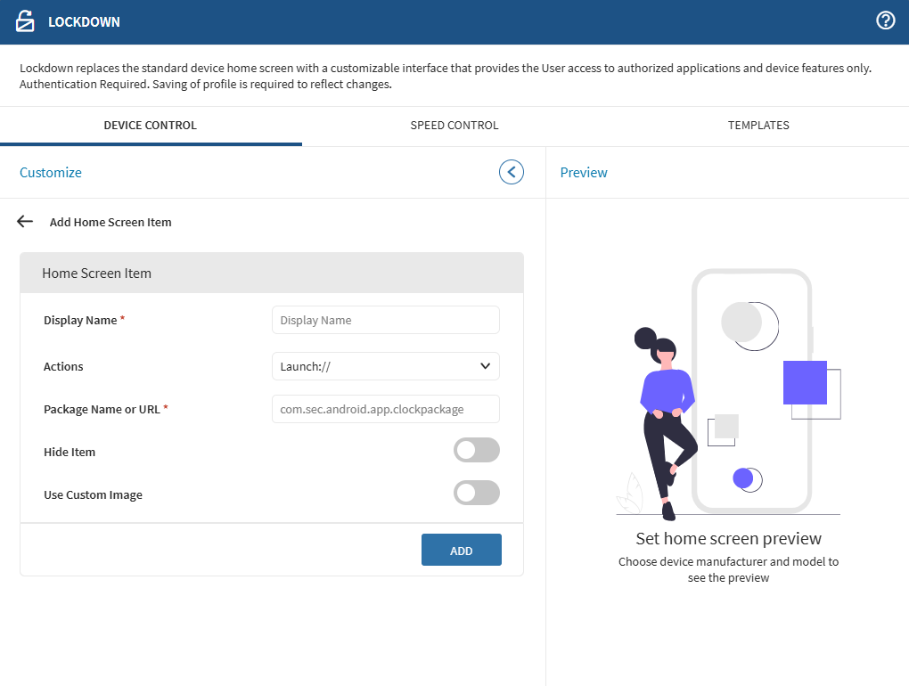Under "Profile configuration" -> "Lockdown" -> "Custom Home Screen" -> "Add Home Screen Items",