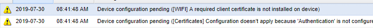 The device logger is showing "Device configuration pending ([Certificates] Configuration doesn't apply because 'Authentication' is not configured)" "Device configuration pending ([WIFI] A required client certificate is not installed on device)"