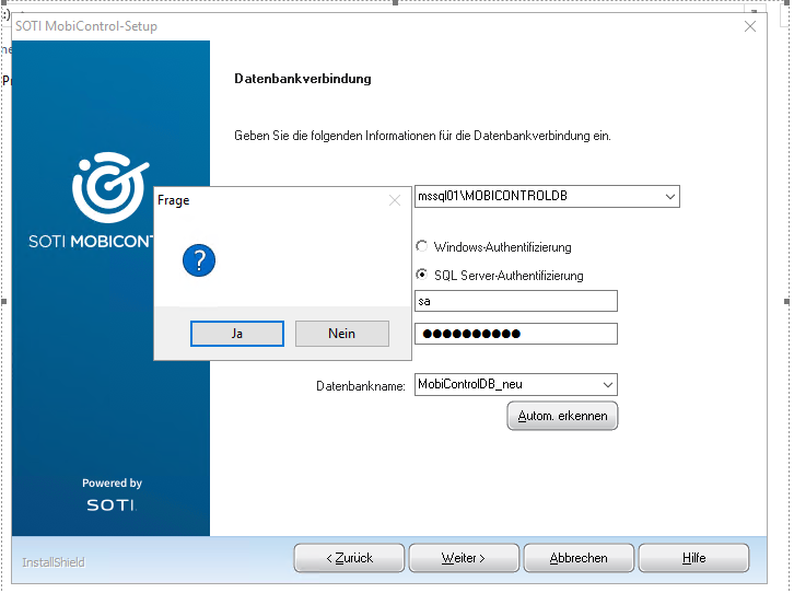 4. Setup says: Management Server is able to access the database, would you like to cancel the connection to the database? Submitted "yes".