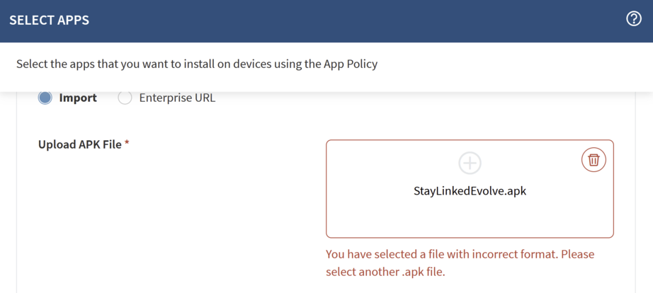 When we try upload the apk to the enterprise application we get the following error : You have selected a file with incorrect format. Please select another .apk file (Screenshot below)