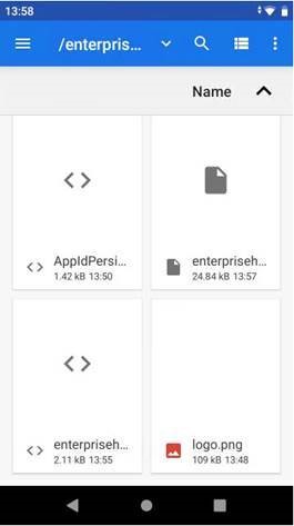 We have pushed a logo and enterprisehomescreen.xml to the /enterprise/usr folder, but when accessing the files using the file browser on the device, the file logo.png cannot be opened.In example below the files are put in the root of the device, where the preview of the png file is there and wallpaper will open like it should.