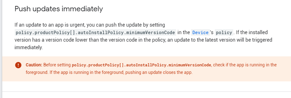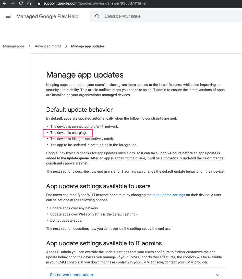 We updated a configuration on one of our Google Managed Play apps in the MobiControl app catalog and yet the app has not updated on the device. The app is set as a mandatory app. From my findings the app should update automatically but the app does not show to update.