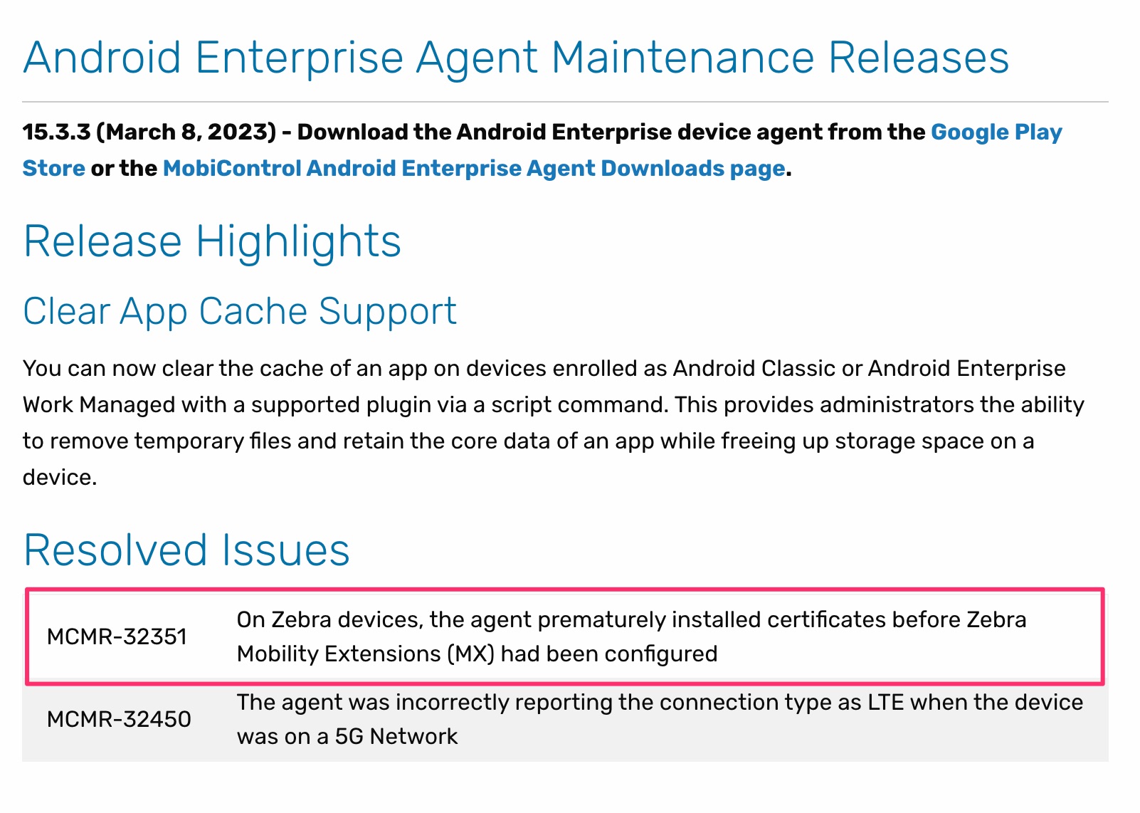Since that agent update in early March, I can no longer distribute internal certificates from our outbound CLA to Zebra handhelds running Android 11 devices (profile stuck on Pending). I was able to narrow down the issue to the Certificate Templates in the Certificates profile settings.