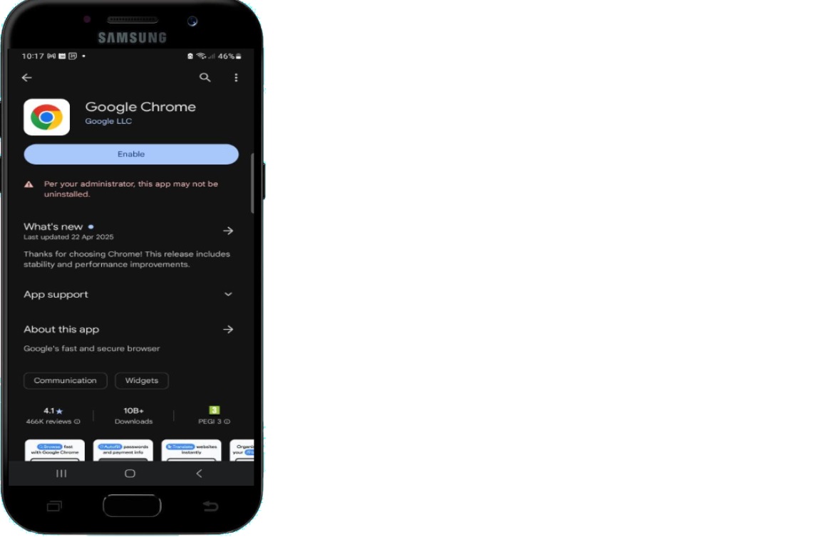 Hi, we have over 2000 devices but 500 are refusing to update Google Chrome. We have tracked the issue down to the fact that something has pulled the default browser to something else meaning that Chrome needs to be re-enabled in the Playstore (as per screen below) before It will update itself