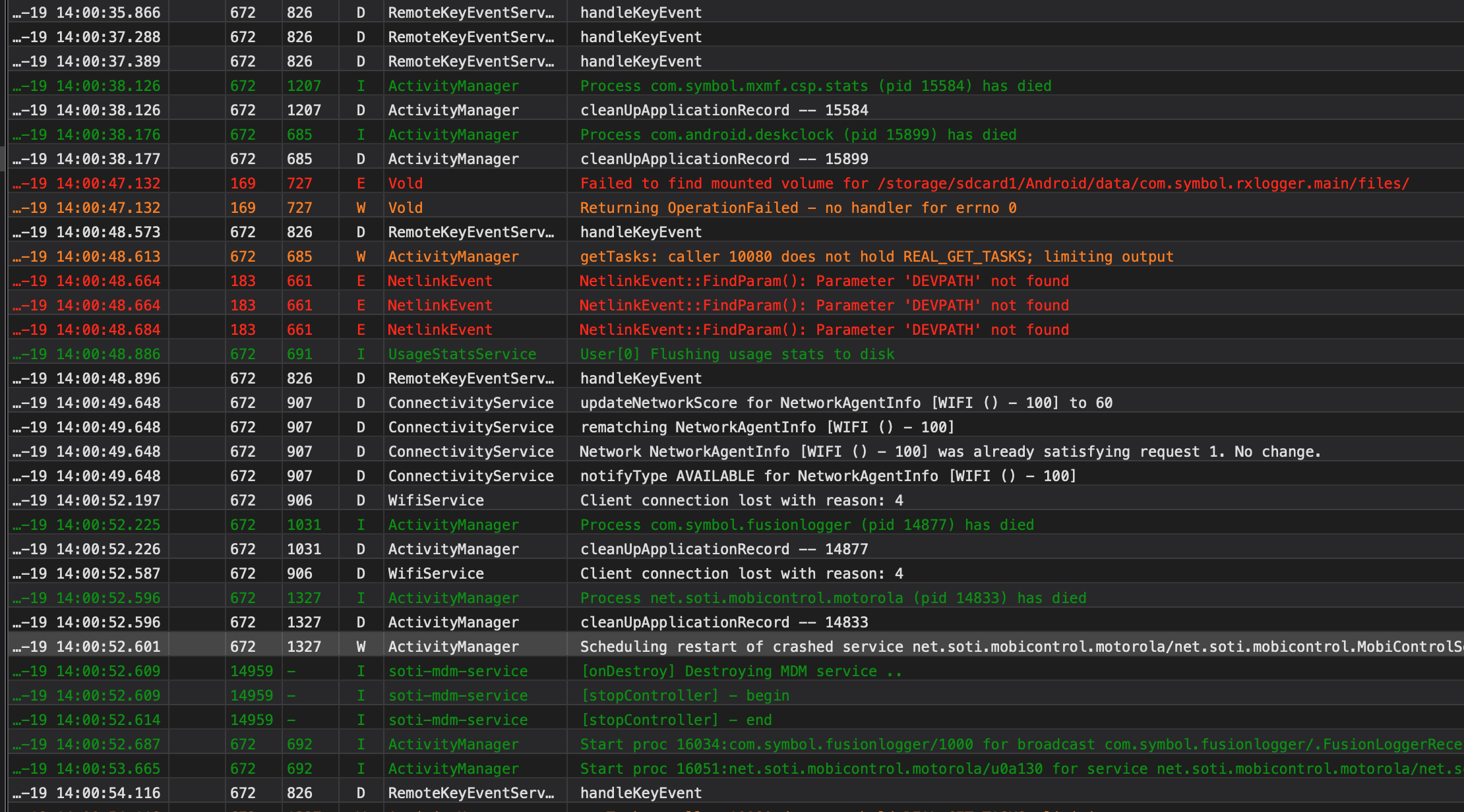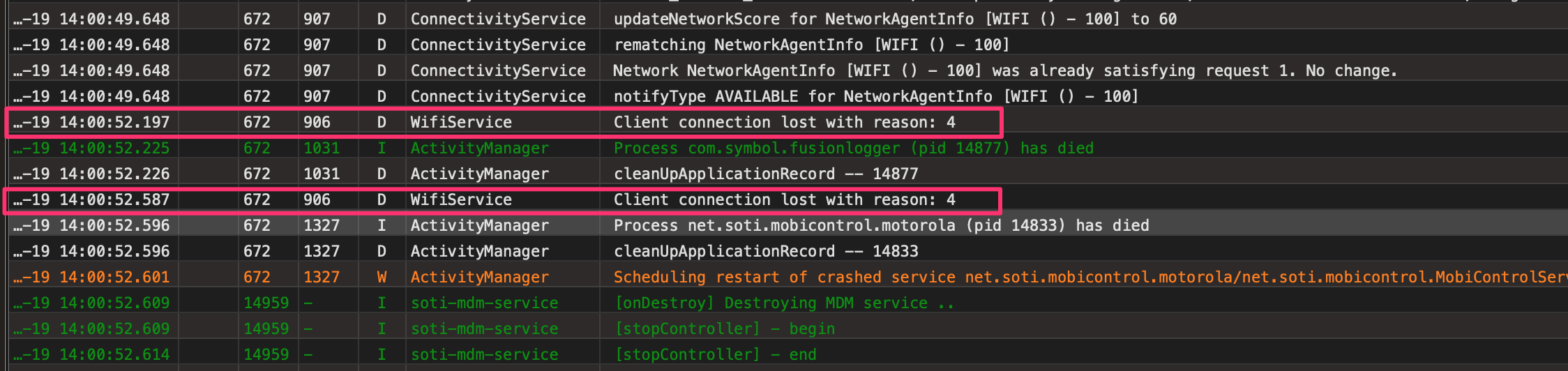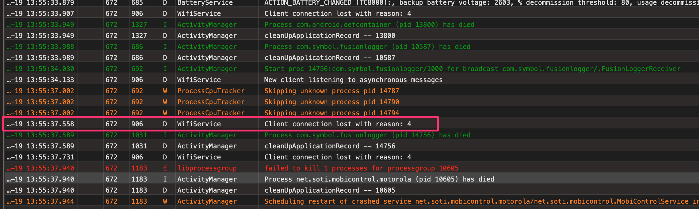 As you can see from the logs of this particular scanner it was constantly disconnecting (all day) until finally at 4:46 PM the scanner froze and I had to force a reboot. This happens a lot on scanners that are connected to SOTI.