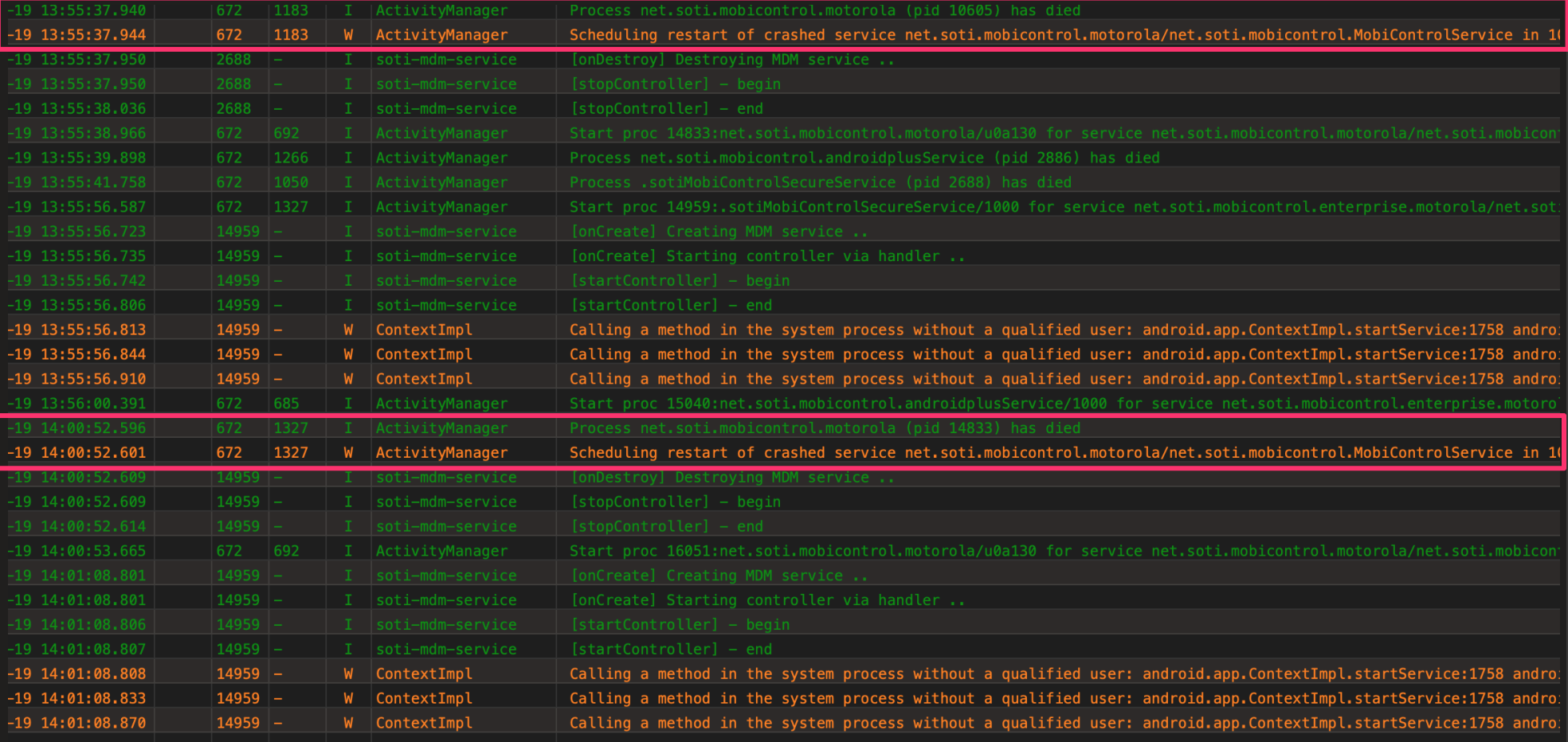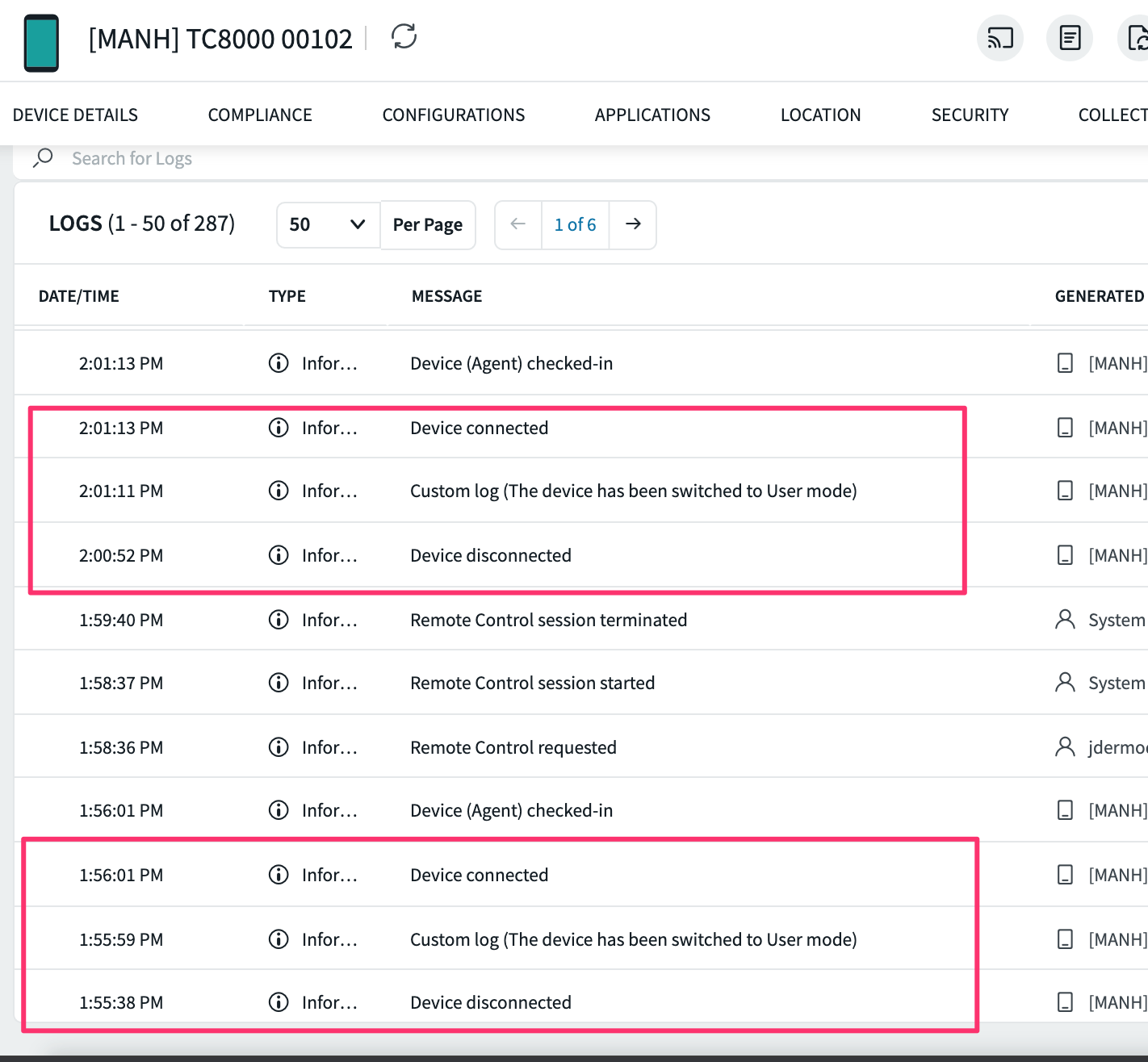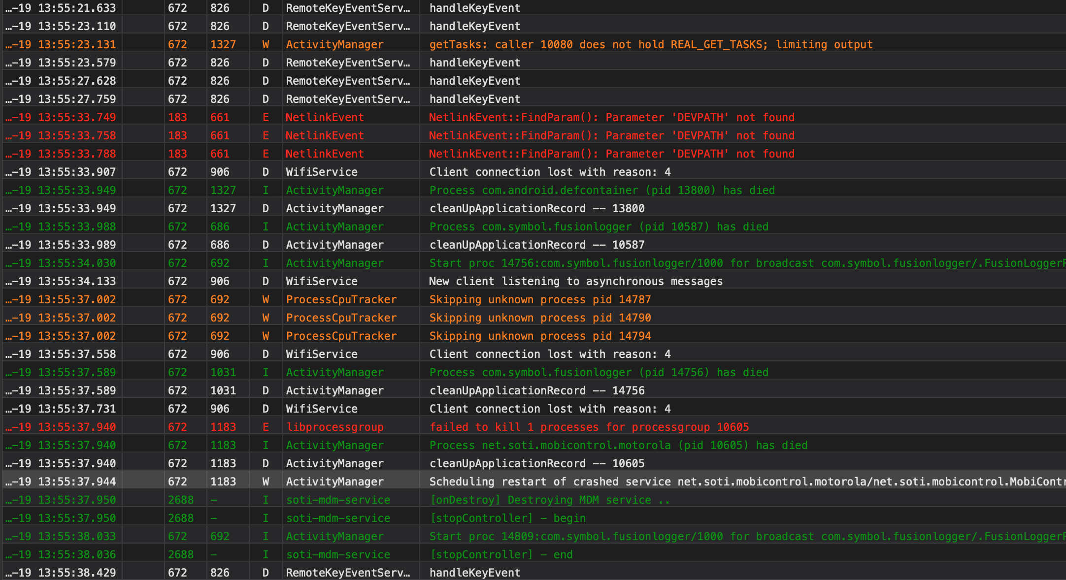 As you can see from the logs of this particular scanner it was constantly disconnecting (all day) until finally at 4:46 PM the scanner froze and I had to force a reboot. This happens a lot on scanners that are connected to SOTI.
