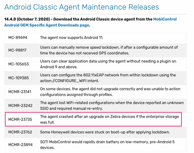 I have been driving myself crazy trying to find the root cause of this. The MobiControl agent on our TC8000 scanners are constantly disconnecting and reconnecting. The worst part of it is that eventually it will cause the scanners to completely lock up and they have to be force rebooted. The workaround right now is to disable the MobiControl agent on the scanners (force close the app) which will prevent them from locking up, but obviously the downside is that I can't remotely manage them while the agent isn't running.