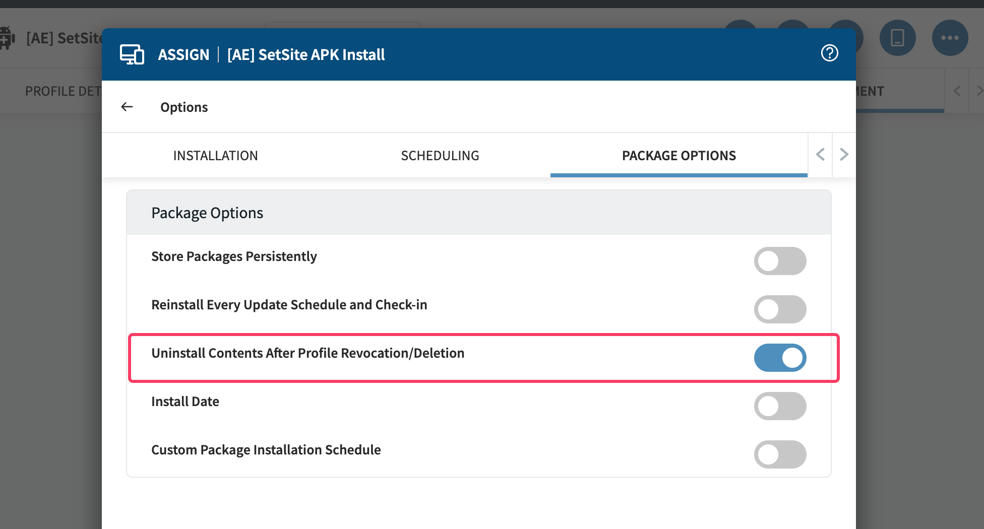 Is there a way to delete the 3rd-party app installed on the device using a profile (where the app package was added to the profile)? When I delete the device from SOTI, the app remains. I would like to know if it's possible to automatically delete the app after deleting the device.
