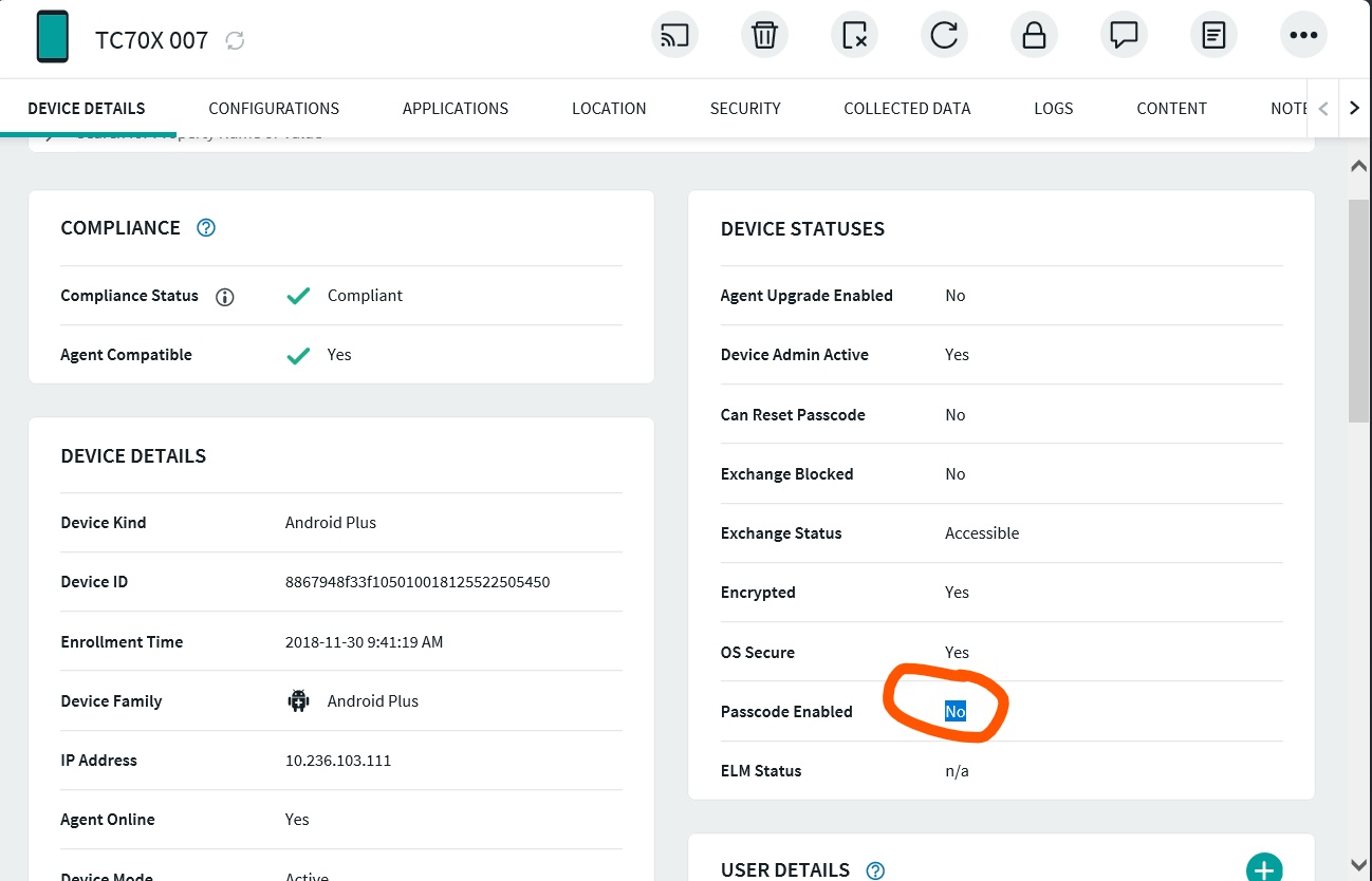 The "can reset passcode" field says NO on my other devices (TC70 running Lollipop) which I can lock just fine. I believe that refers to whehter or not the end-user can reset the passcode.