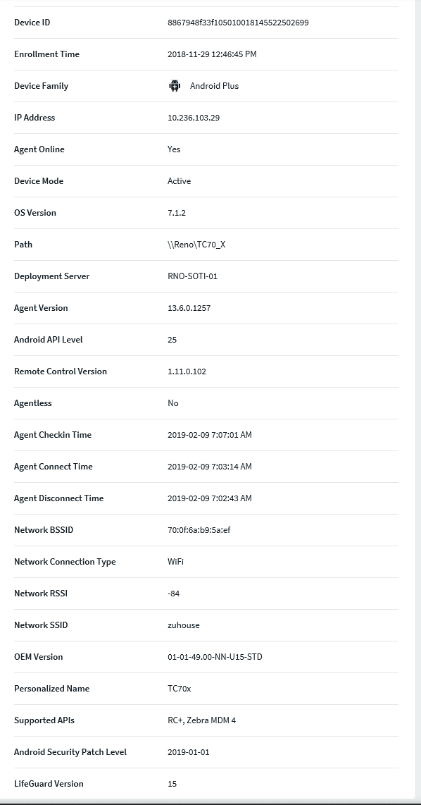 My apologies, I misunderstood about the api. The device agent = 13.6.0.1257, Zebra MDM 4. Pic is attached