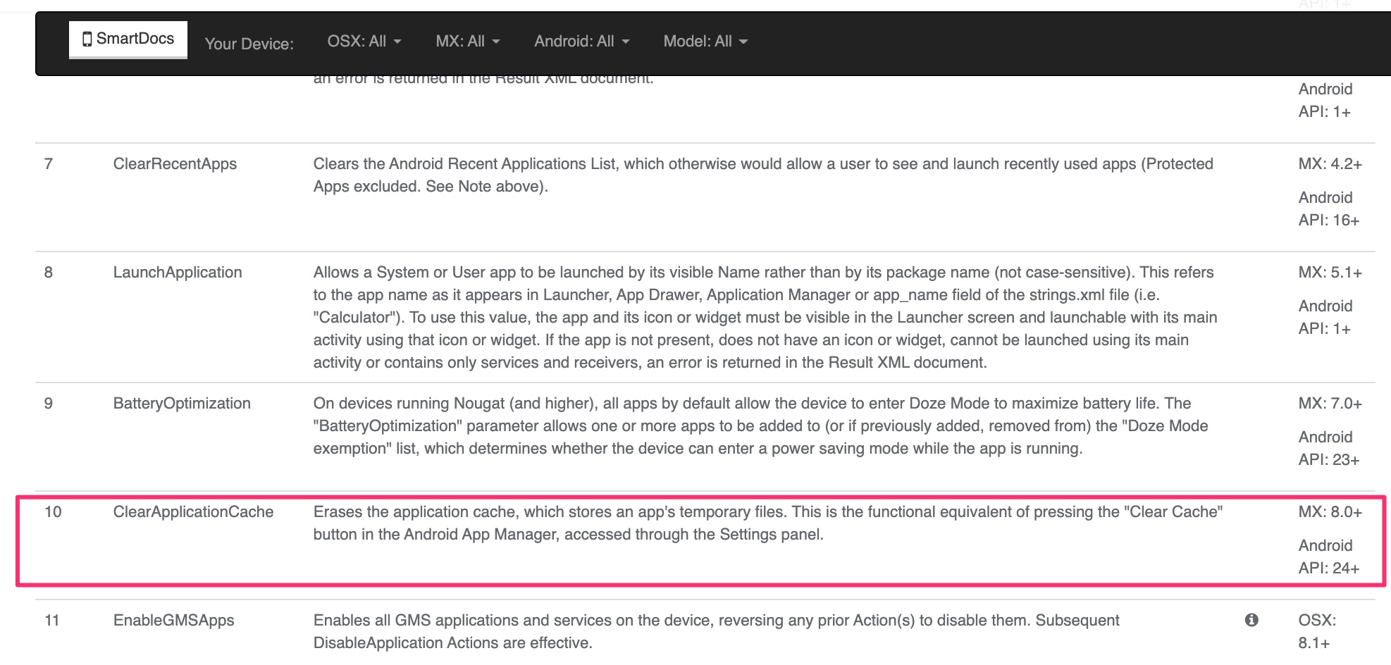 the only thing working is wipeapplication and thats on honeywell devices running pie.
