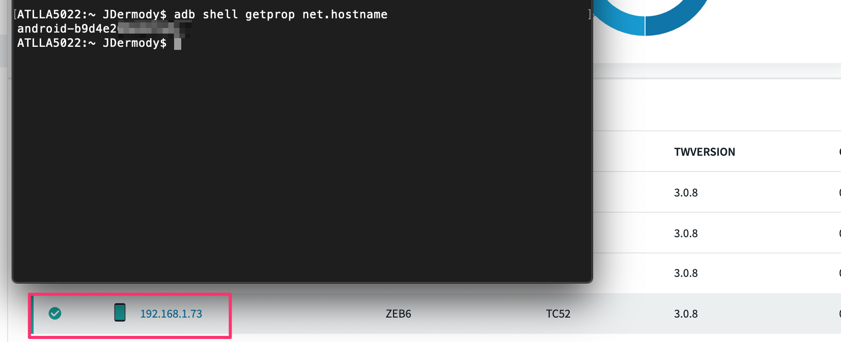 Remote with the command "getprop net.hostname"