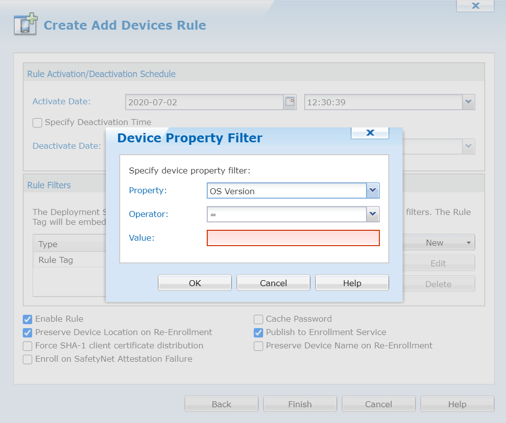 By default, an add devices rule adds only those devices that are running a device agent created specifically for that rule. Rule filters enable you to broaden or restrict which devices get added by the rule when they connect to SOTI MobiControl. There are four types of add devices rule filter: a rule tag filter, a IP address filter, a device property filter, and a firmware version filter.