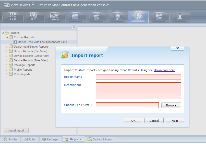 If possible and you choose to do this on your own, the reports section has an Import button in the bottom left hand corner from which you can select and navigate to i-net Clear Reports VIA the Download here link. Once the report is created it can be imported back into the MobiControl console and should be available as a custom report from which you can then schedule the report.