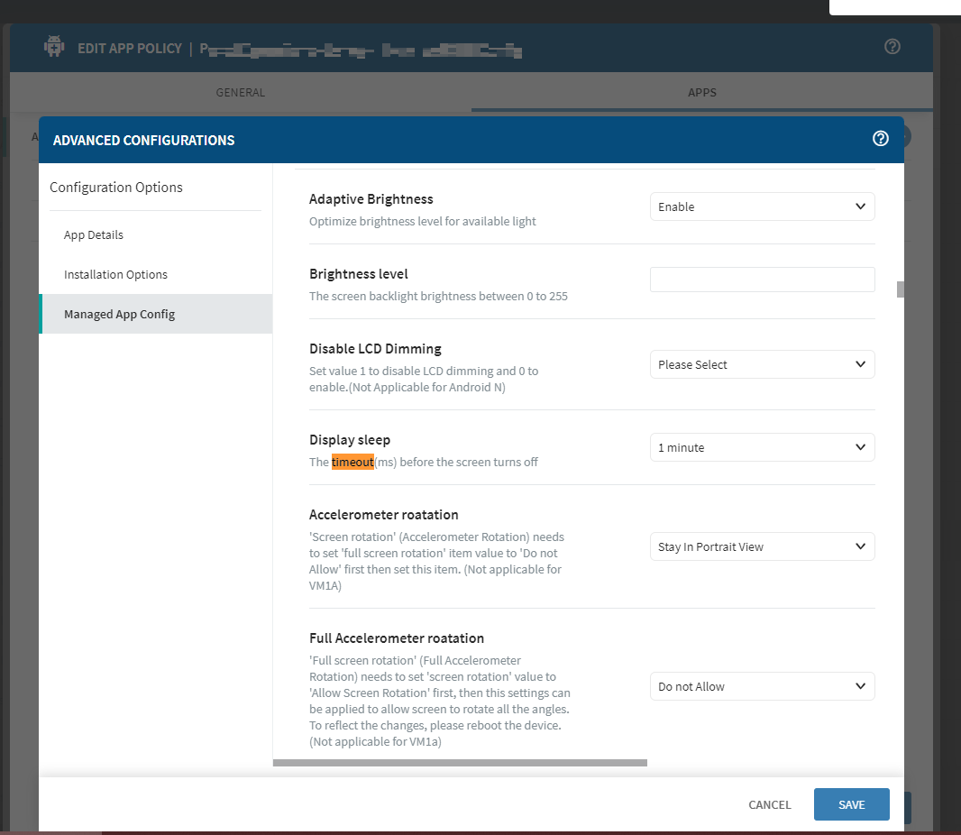 I am currently trying to figure out how to set the screen timeout from 1 minute to 3 minutes without having to manually go into each device putting it into admin mode and going into the device settings to change it in the display settings. Is there a way to get this done all on Soti Mobicontrol efficiently.