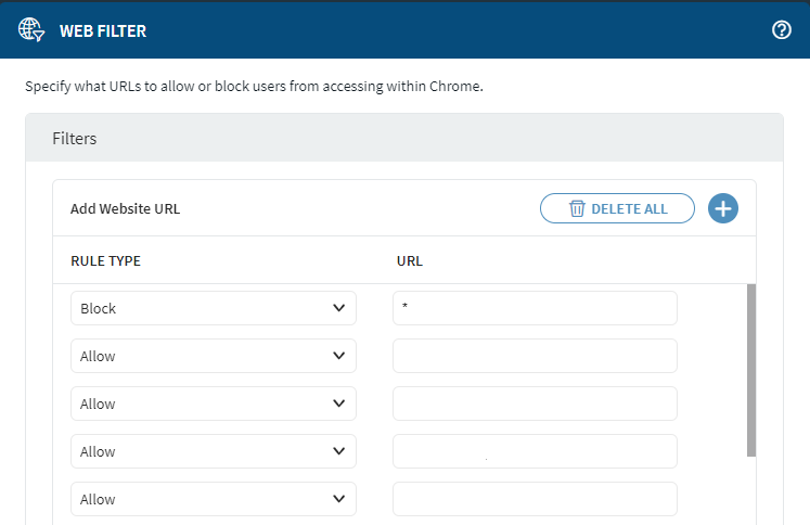 I have tried using the Web Filter options to only allow the preset websites (see below screenshot- websites blanked out), but the links onto other domains still work. I've also looked at using Soti Surf as a browser but can't see how to configure it on the cloud hosted server.