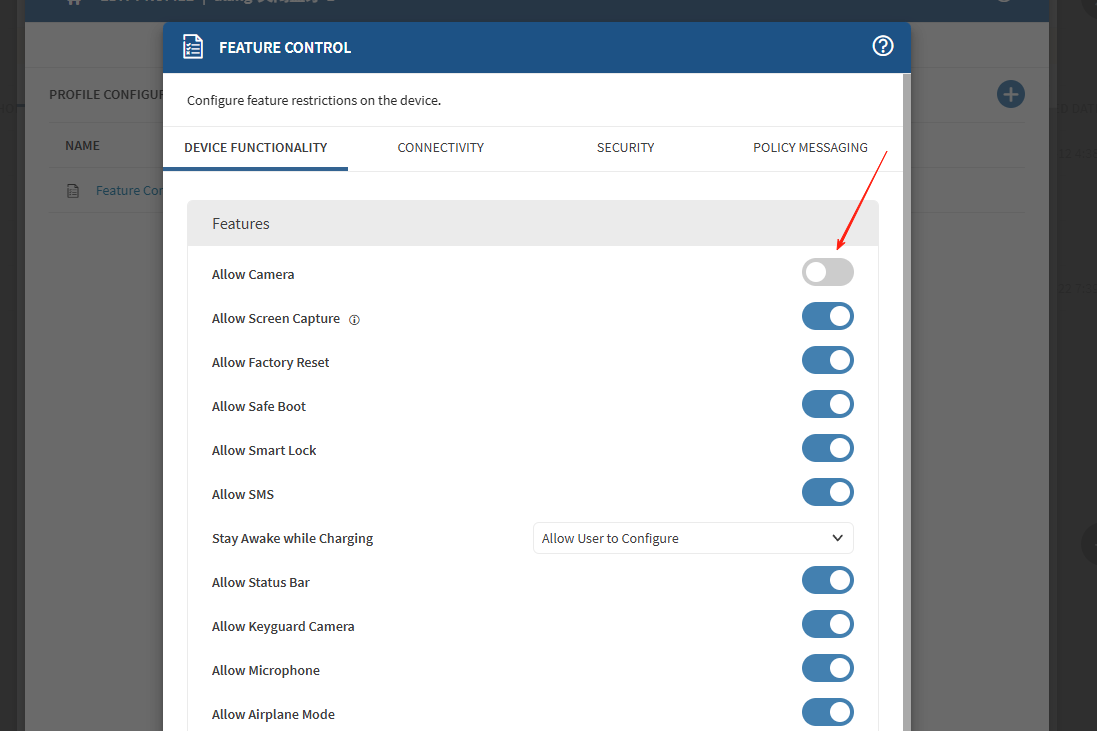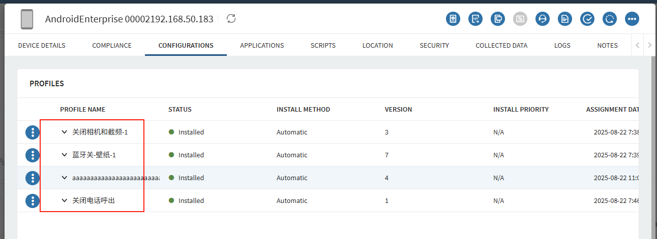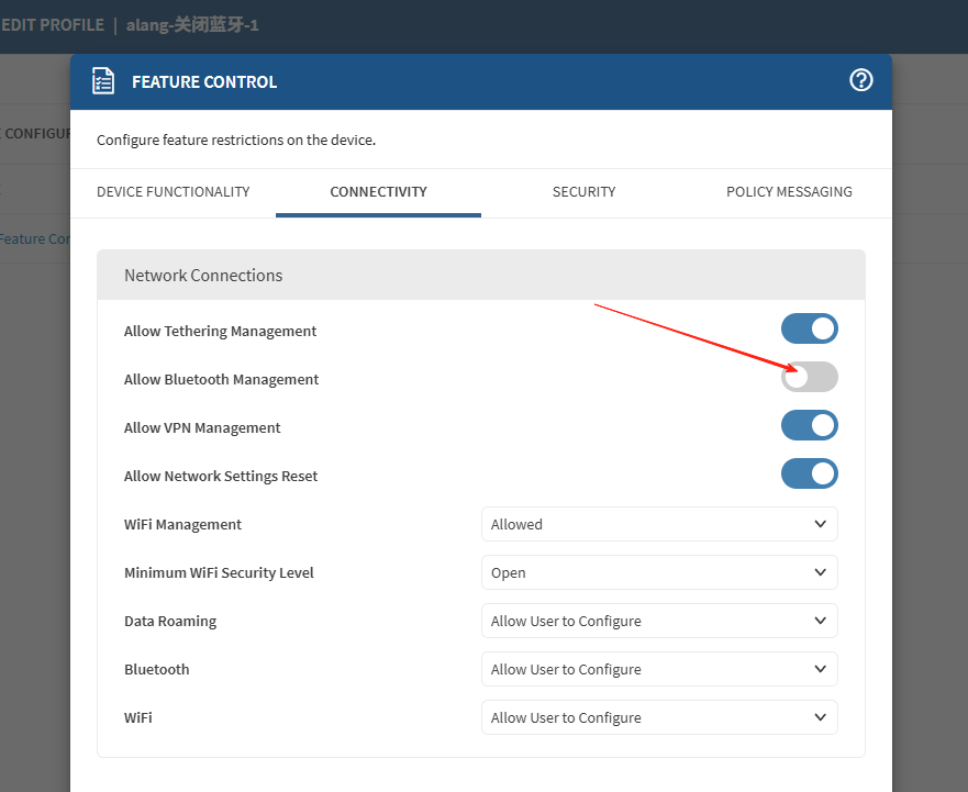 I have some questions about the device profile policy and need to consult. In the function control, 4 profiles were created. Now I have found a problem. As long as one of the 4 profiles disables Bluetooth or camera, the device will disable Bluetooth or camera, regardless of the order of pushing policies. In addition, the other 3 policies will not take effect even if Bluetooth or camera is turned on. What is the priority rule for device effectiveness? Why does the new push not overwrite the previous push? Will there be similar logic in other policy configurations?