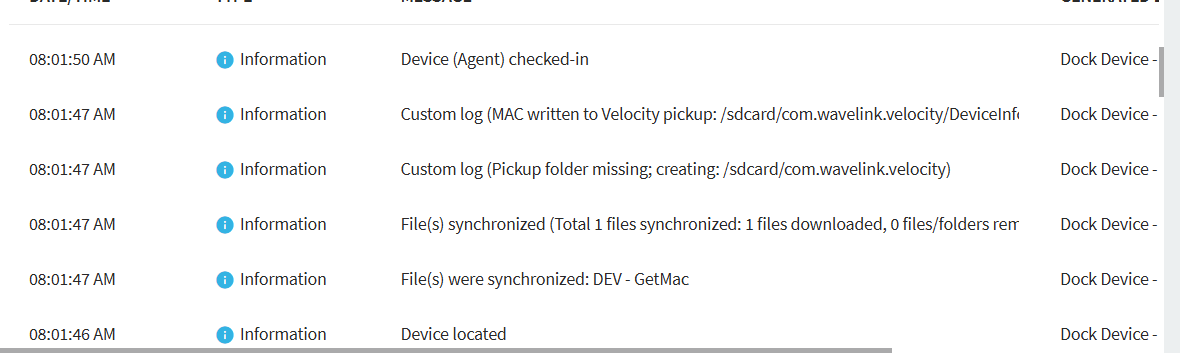 I have this working manually but trying to automate the js file using file sync. Velocity needs to read in the MAC address for each device. I have the .js script, that when sent manually will create the folder sdcard/com.wavelink.velocity and put the file into it containing the mac address (DeviceInfo.txt). Velocity file assisant will move it from there.