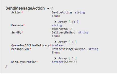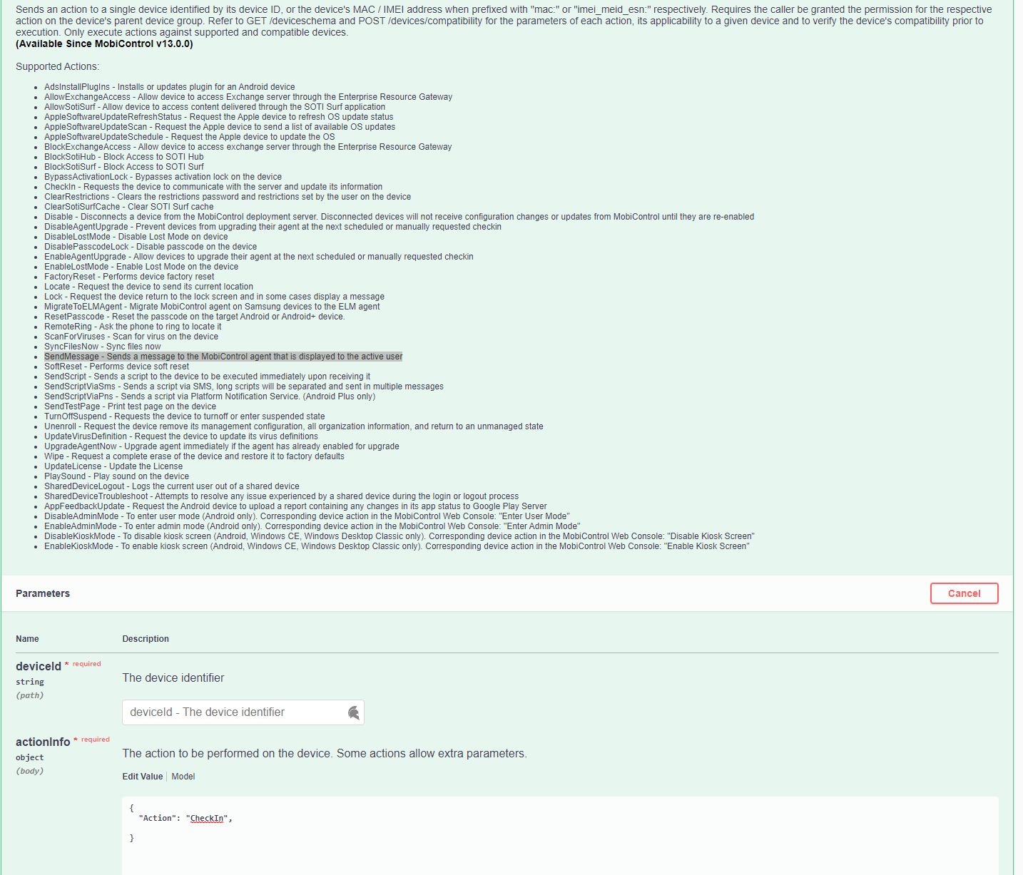The documentation is fairly limited on APIs, one of the most helpful pieces of advice I had when using the APIs was the following. In Mobicontrol, select your device and choose your action e.g. SendMessage. Before pressing send, press F12, network and expand the action. This (in come cases) give you an idea of what the Method/URI/Body etc are for the actions. They wont always give you the exact answer youre looking for but are usually more helpful than the documentation.