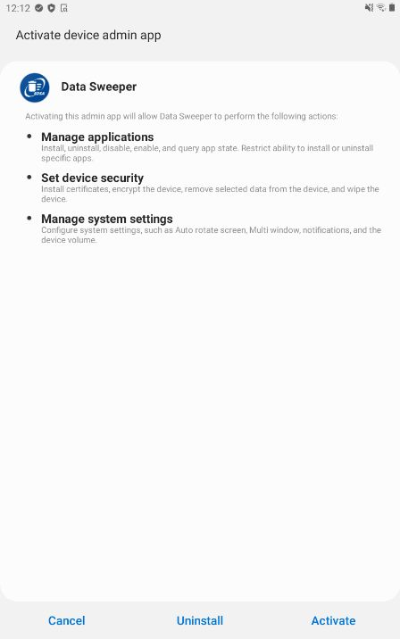 Has anyone dealt with the SDS Data Sweeper app? After packaging and installing it will prompt to be an device admin on Android Enterprise. It also requires the Appear on top Permission. Any one have any luck including a script in the package to automatically activate and grant the permissions needed? I have a company that will want it installed on about 2000 Shared Samsung devices that are already out in the field. We don't want to have to manually go activate the app. I have asked the developer a couple of times but have not gotten an answer yet from them. Or does anyone have any other solutions for clearing website cookies and cache for more than just Soti Surf. Data Sweeper can be configured to clear the data after a timeout period of inactivity or after detecting a charging state. Let me know what you have.