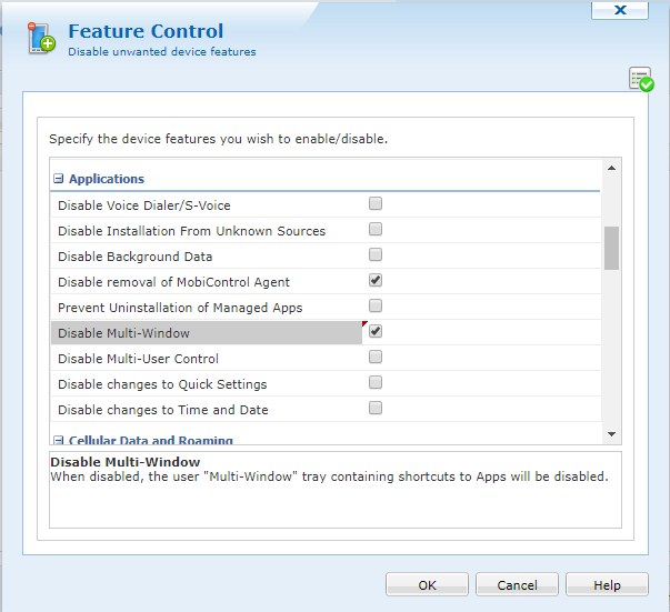 I need to know the package name for the Multi Window (see picture below), I want to blacklist it from the SOTI Mobicontrol platform.