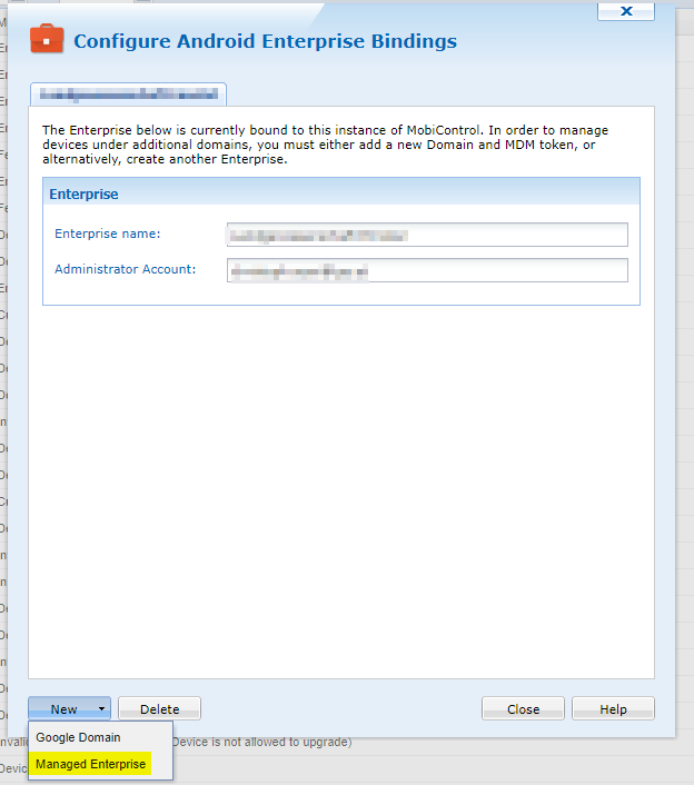 I use MobiControl 14.3.1.1189 on premise and I created an Managed Enterprise and also added this to our enrollment rule.