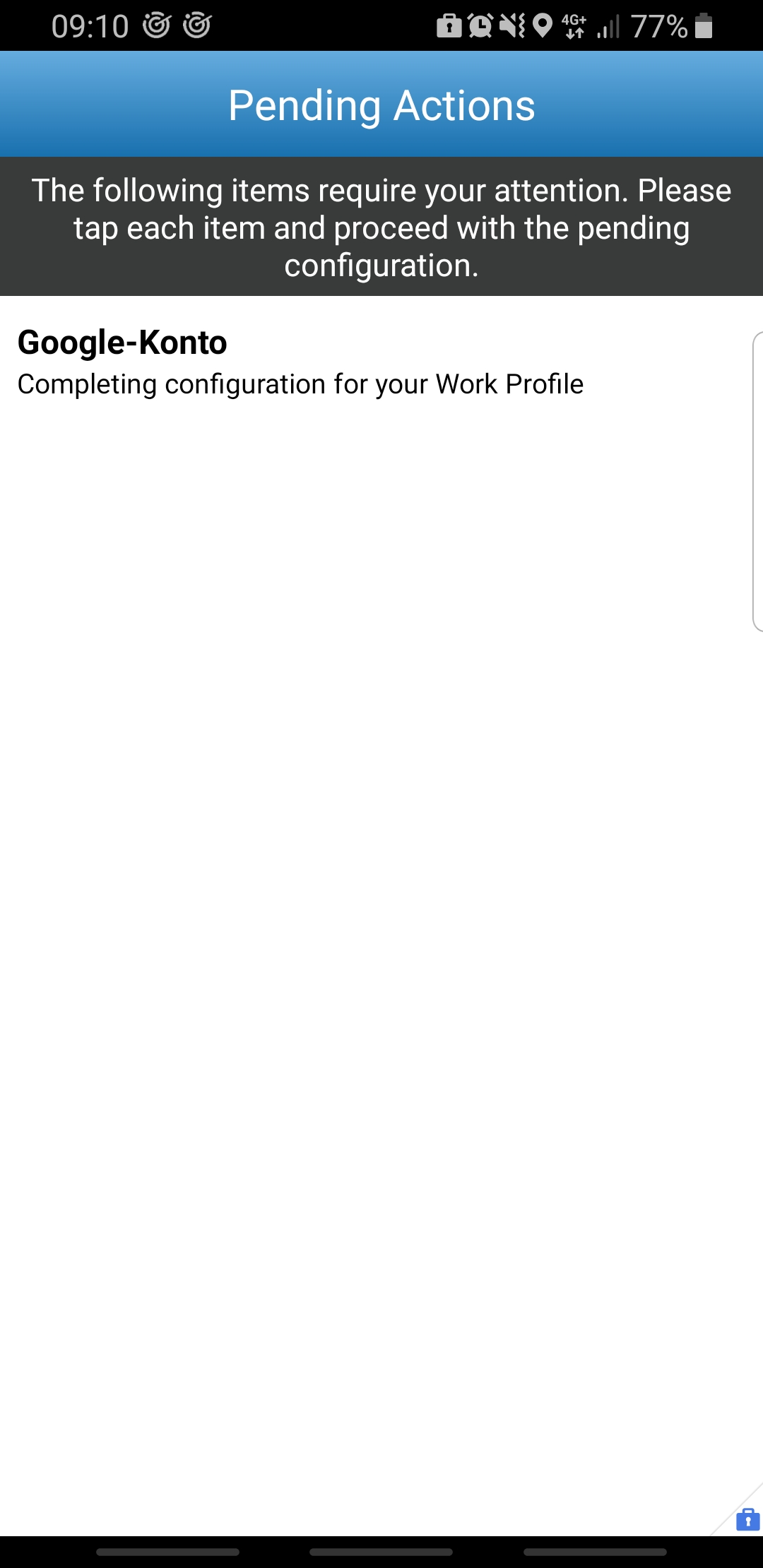 On the device I get the pending action to add an account, but if I click on the entry, nothing happens and in the logs I can see the following message: "Error message received from device (Managed Google Play Account Status:'EMPTY_TOKEN')"