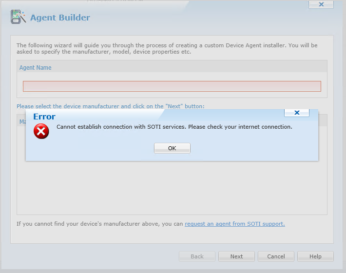 Getting error when building new agents "Connot establish connection with SOTI servicew. Please check your internet connection. See image