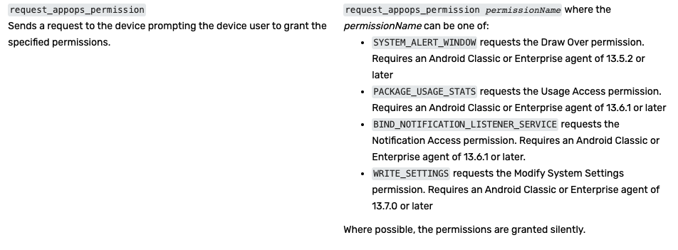 Is this what you are referring to? These are the subsettings requested by the SOTI agent. The WRITE_SETTINGS permission does need to be granted in order for the writesecuresetting script to work, but even then you will find mixed results with Android Enterprise managed devices.