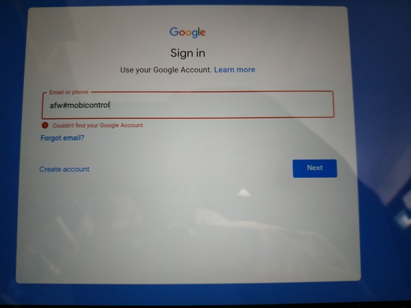 I am trying to install Soti Agent on my Lenovo Yoga Book (Android 7). After the default recovery, when prompted to add a Google account, I am entering afw#mobicontrol and I receive the message "Couldn't find your Google account".