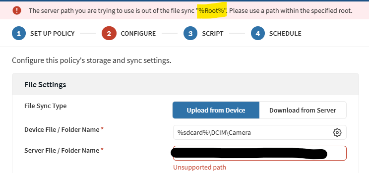 Try to look here: https://discussions.soti.net/thread/file-sync-policy-android-unsupported-path