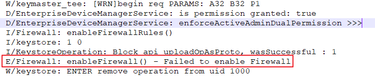 6. logcat_enableFirewallFailed.png - shows the line in logcat on Android where it says "Enable Firewall failed"