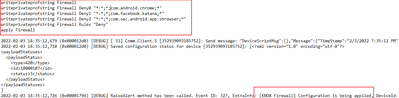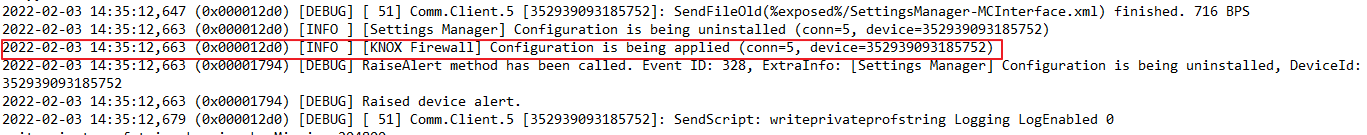 3. screenshot below shows in the Deployment server logs that the Knox Firewall rule is being pushed to the device