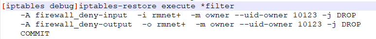 5. screenshot below shows the commandin logcat on the android phone the IPTables command being run on the device.