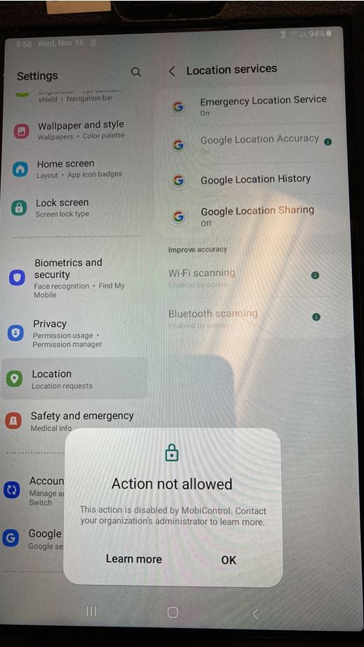 Recently our android enterprise samsung Tab a7 devices have been disabling certain settings on the tablet. Previously it worked well. We have not made any changes to our admin profile and have combed through each configuration in our profile. However, we cannot seem to find the setting that controls location services and other settings. I will attach a screenshot below of the issue: