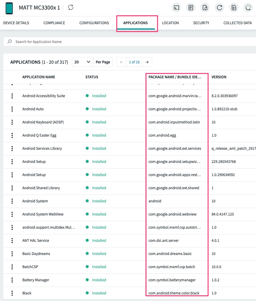 All of the Package Names for enabled applications should be listed under the Applications tab for a device: