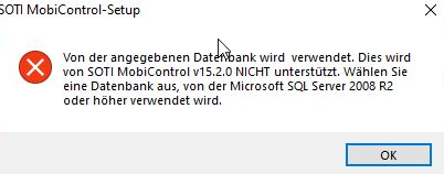 The Specified database uses, which is NOT Supported by Soti MobiControl V 15.2.0 Please choose a Database Using Microsoft SQL Server 2016 or Above