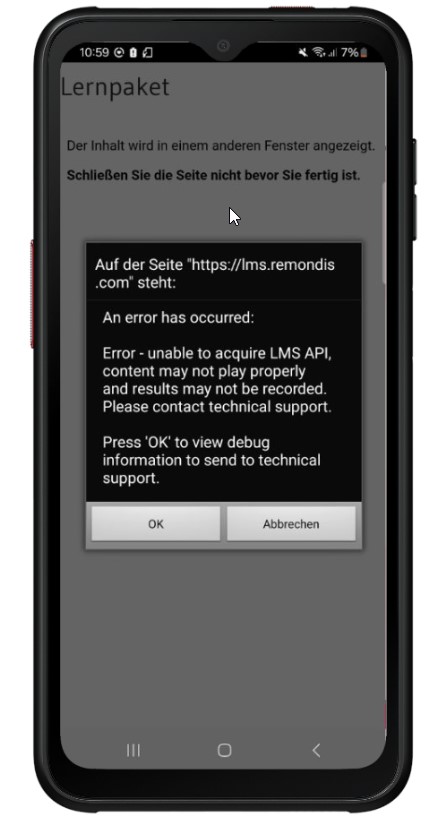 Error while using learning plattform (LMS) in kiosk mode