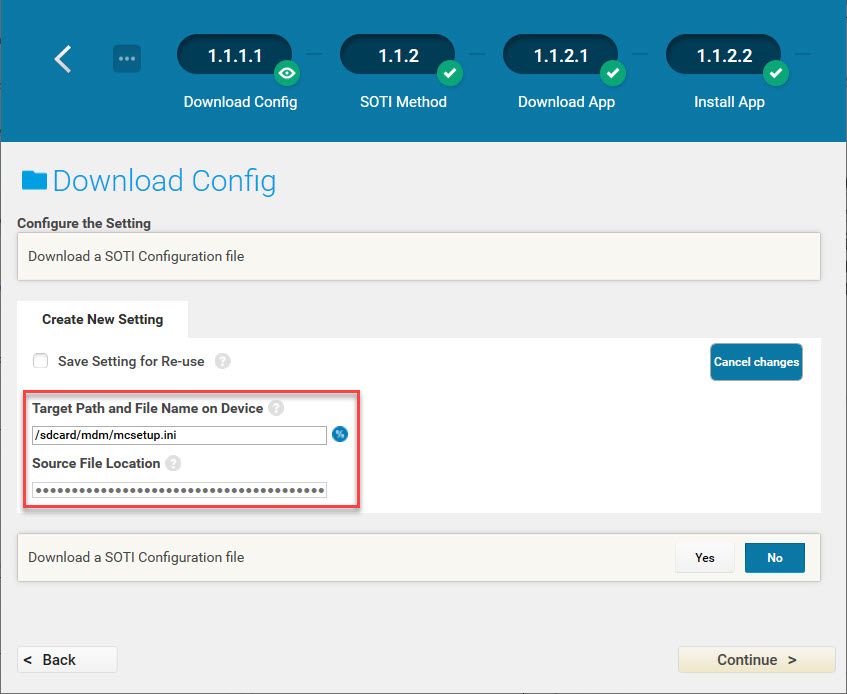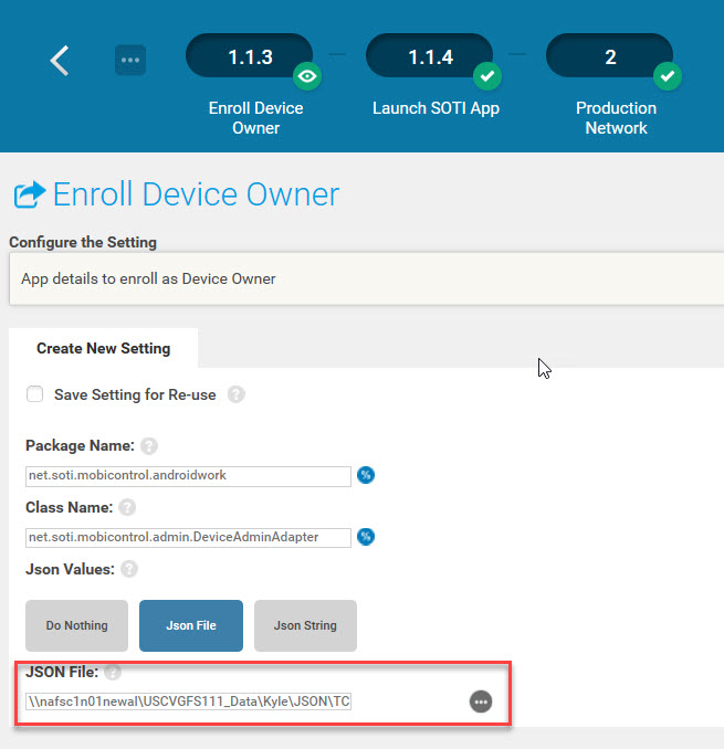 So I am trying to setup our device enrollments on an FTP server. Part of the Enrollment is the JSON file that holds the Enrollment ID. With something like the Agent file I can select to use and external source. I store the Agent on an FTP server and enter "ftp-p://USERNAME:PASSWORD@ftp.domain.com:21/Agents/GoogleMobiControl1442_1039.apk" in the external source. I do the same thing with the .bin file for the deployment package. This works great and I love it. Now when I get to the JSON file it only lets me select a file from my PC, I do not get a selection for an external source.