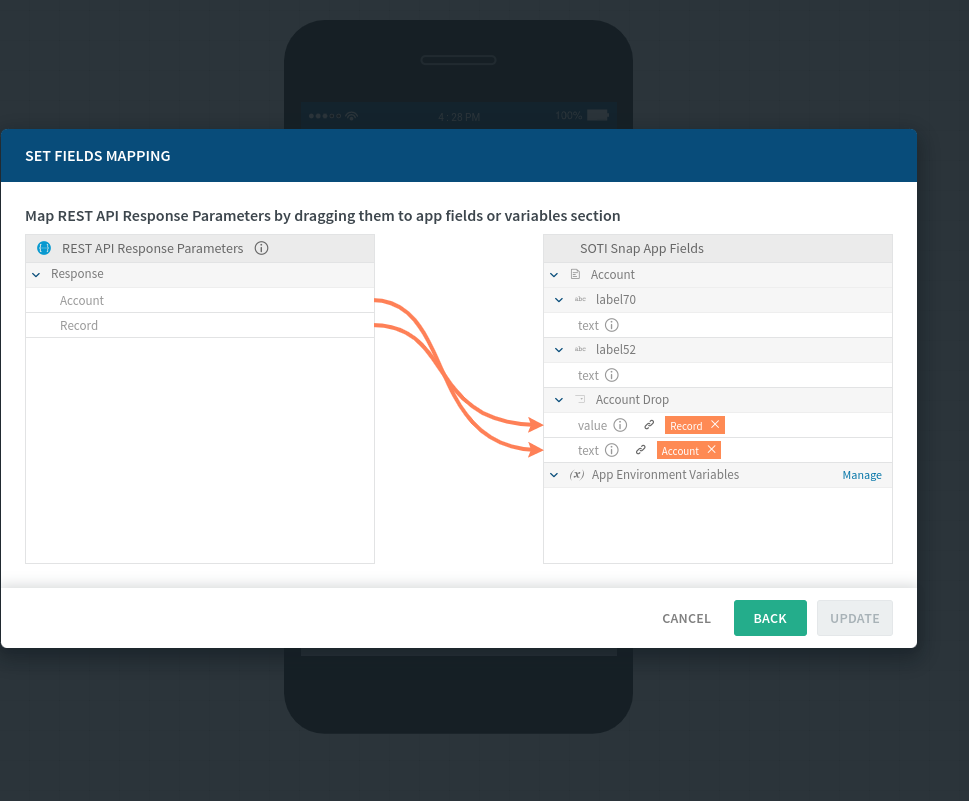It is possible map the data response from an REST API to a Dropdown widget provided the response is an array. Once you have set up your REST API connection under Data Import/Export (Please let me know if you need any assistance with this), you can invoke the REST Data Connection at the required event and map the response as follows: