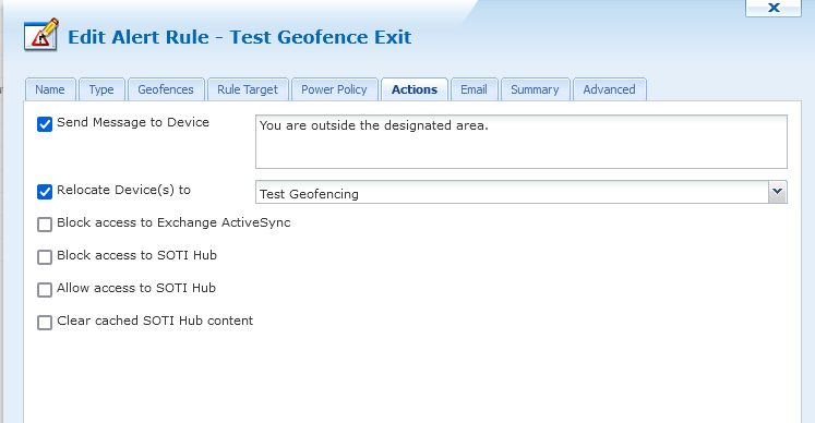 I searched for an instruction on how to set an alert/action when a device exits a geofence but couldn't find any.