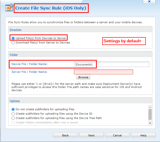 Contrary to Android, Apple devices have tougher security restrictions, and \Documents\ is the only directory that can be accessed using File Sync for iOS platform. You may also create subfolders within \Documents\ (See Options to create subfolders, etc.).