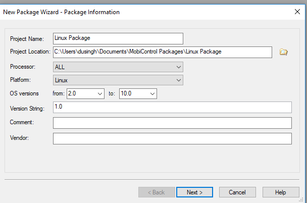 Would it be possible to know which version of MobiControl you have downloaded the Package Studio from? You may have to obtain an updated version of package studio, as the later versions have the option for Linux.