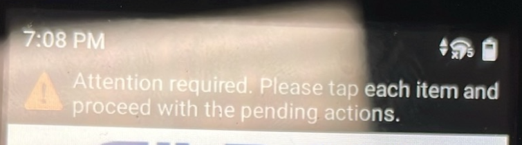We are getting a popup on our scanners that reads "attention required please tap each item and proceed with the pending actions". When this happens, the scanners stop connecting to MobiControl. When we enter the admin credentials, we are prompted to grant SOTI permissions. This happened all of a sudden on scanners we've been using for years. Any idea what the root cause could be?