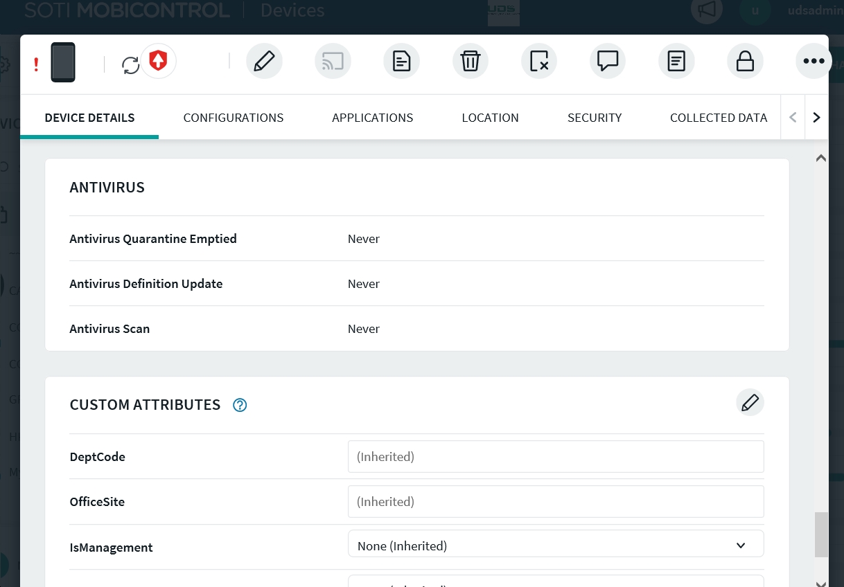 I have : COMPLIANCE / DEVICE DETAILS / CELLULAR DETAILS / DEVICE STATUSES / USER DETAILS / HARDWARE DETAILS / ANTIVIRUS / ANDROID ENTERPRISE