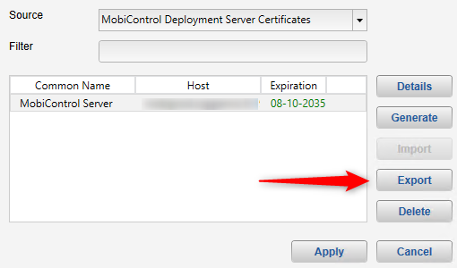 We would like to change our MC server (v14.4.9.1034) and plan to backup / restore the MobiControl database on a new machine (same MC version). Could you please tell me where are the certificates stored on the server or how to export them from the Administration Utility?