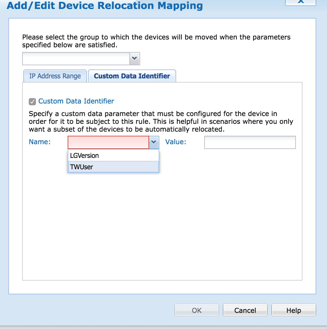 Relocation Rules would require that you set up custom data and that you would sync a file containing the device's name to the device to action on the custom data.