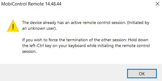 By opening a remote control session to a device (we are using CK75 and CK65), the session crashes (for a network issue or any other reason), we can not open again a session to this device. SOTI Assist version is 3.0.1.15 (latest version). The error message that I get is :